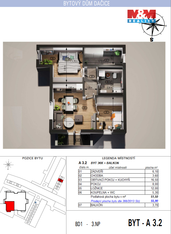 Připravujeme prostorný byt 3+kk (55,9m²) v moderní energeticky úsporné dřevostavbě na Červeném vrchu. Byt bude vybaven v tomto standardu: Koupelna (dlažba, obklad, toaleta, vana nebo sprchový kout, umyvadlo, baterie). Podlahové krytiny - (dlažba, plovoucí podlaha). Součástí jsou dveře a dřevěné obložení v dekoru, vnitřní parapety oken. Vytápění je řešeno společným plynovým kotlem s radiátory v obytných prostorách a topný žebřík v koupelně. Dále Vám byt nabídne vlastní parkovací stání a praktickou komoru, která poskytne dostatek úložného prostoru. Výstavba začne v září 2025 a k nastěhování bude od října 2026. Dačice jsou město s jedinečnou atmosférou na pomezí Čech a Moravy, nabízí historické centrum se zámkem, útulné kavárny i přírodu na dosah.