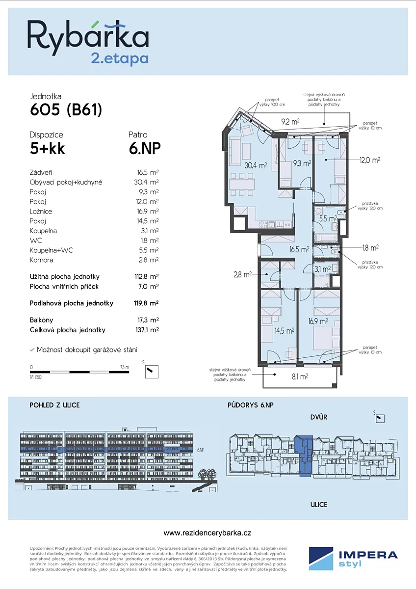 V rámci druhé etapy moderního rezidenčního projektu Rezidence Rybářka nabízíme k prodeji byt o dispozici 5+kk s podlahovou plochou 119,8 m², situovaný v 6. nadzemním podlaží osmipodlažní novostavby. Tento byt je ideální volbou pro ty, kteří hledají komfortní bydlení v centru města.