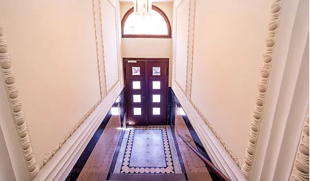 Interiér prošel citlivou a nákladnou rekonstrukcí s důrazem na zachování původních architektonických prvků – vysoké stropy, renovované dřevěné parkety a stylové detaily vytvářejí harmonické spojení historie a moderního komfortu.