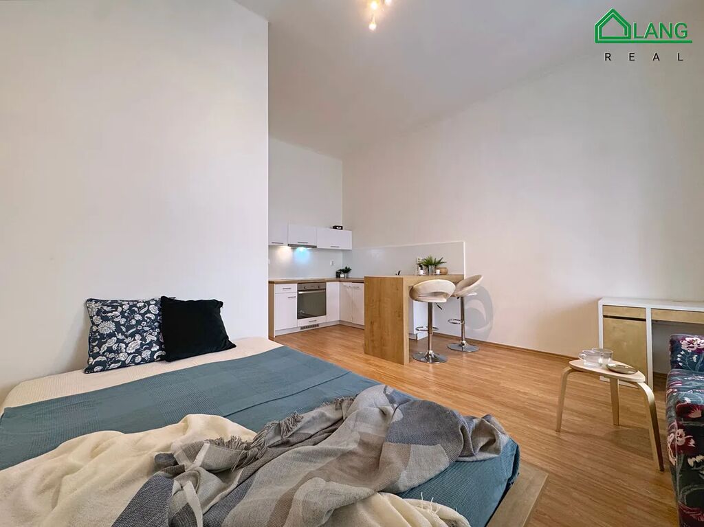 Kuchyňský kout je vybaven linkou, troubou, sklokeramickou varnou deskou a lednicí s mrazákem. Dělícím prvkem mezi kuchyní a obývacím prostorem je minimalistický barový pult s dvěma židlemi. Pokoj je tak opticky rozdělen na kuchyňskou a na obývací část, která je zařízena manželskou postelí, gaučem a pracovním stolkem.