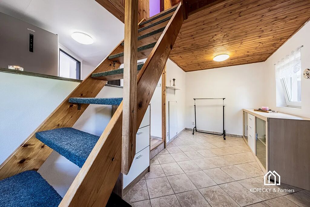 Kuchyň je prakticky propojena s obytným prostorem a působí svěže a funkčně. V podkroví se nachází ložnice s dostatkem úložného prostoru, kterou lze využít i jako pracovnu nebo dětský pokoj. V suterénu je sklep a k dispozici je i kůlna pro uskladnění nářadí. Na pozemku je vybudováno parkovací stání a vjezd na pozemek zajišťuje elektrická brána s dálkovým ovládáním, což podtrhuje komfort i bezpečnost celého objektu.