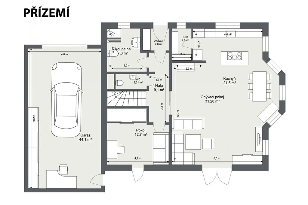V přízemí domu se nachází prostorný a světlý obývací pokoj, propojený s moderně zařízenou kuchyní, vybavenou kvalitními spotřebiči. Přímo z obývacího pokoje můžete vstoupit na terasu, která je ideálním místem pro odpočinek, rodinná setkání nebo grilování. Dále je zde samostatná pracovna, praktická koupelna se sprchovým koutem, technická místnost a prostorná garáž pro dvě auta s dílnou.