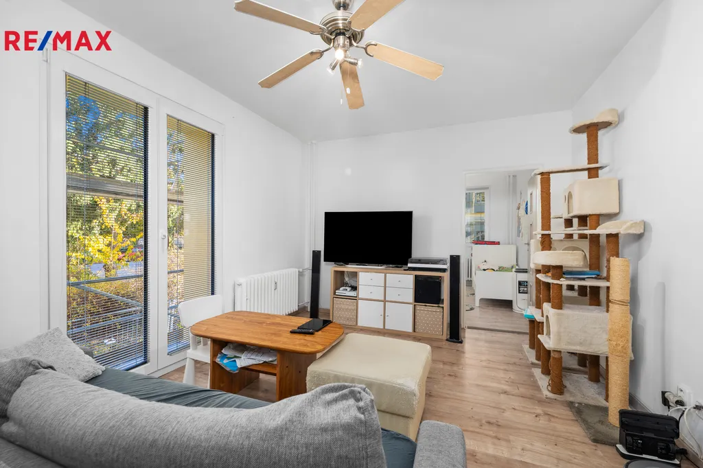 Bytová jednotka o ploše 65 m2 je šikovně dispozičně rozdělena na dvě ložnice, obývací pokoj s novým balkonem, kuchyni, koupelnu se sprchovým koutem a toaletou a prostornou předsíň. Byt i bytový dům právě prošly rekonstrukcí a revitalizací. Byt je osazen novými plastovými okny se žaluziemi i sítěmi, zabezpečen protihlukovými, protipožárními dveřmi, má novou vyzděnou koupelnu s WC, po celé podlahové ploše (vyjma koupelny) je položena plovoucí podlaha a byly udělány nové rozvody elektřiny v mědi. Nabízený byt je udržovaný a působí příjemným dojmem. K bytu navíc náleží sklepní kóje a možnost užívání přilehlé garáže. V rámci revitalizace domu bylo provedeno zateplení fasády a sklepních prostor, výměna oken i ve společných prostorách domu a osazení nových balkonů.