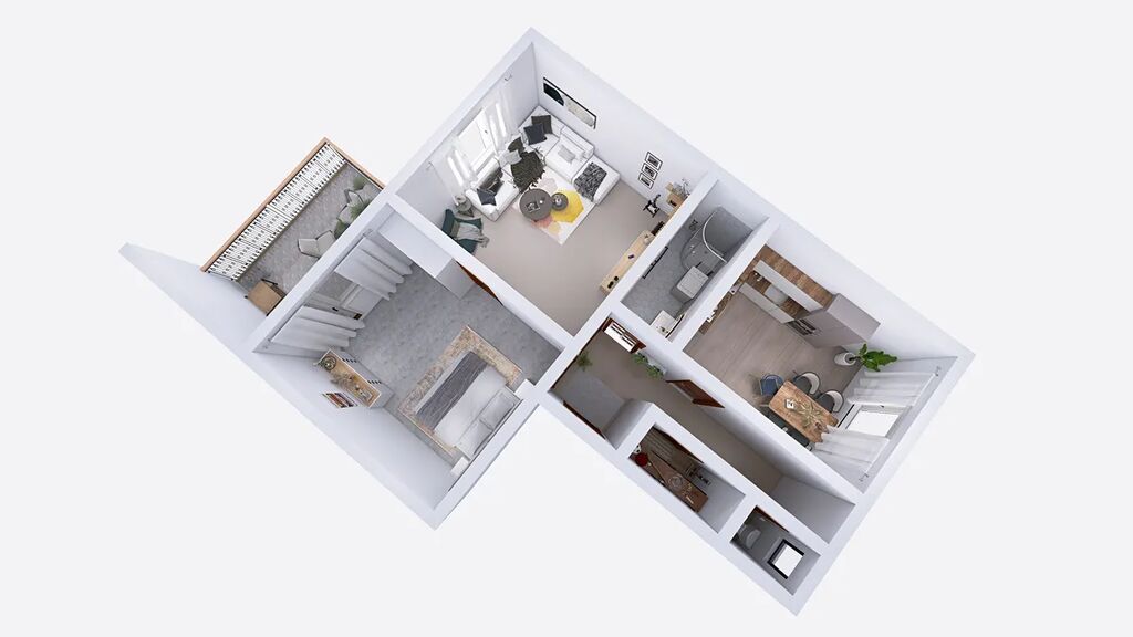 Dispozice bytu zahrnuje vstupní chodbu, prostorný obývací pokoj, ložnici, kuchyň s jídelním koutem, koupelnu s vanou, samostatné WC a spíž.