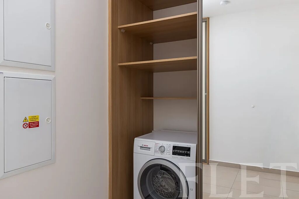 Interiér bytu působí vzdušně a promyšleně. Hlavní obytná místnost nabízí propojení kuchyňského koutu s moderní linkou a spotřebiči, jídelní části a prostoru pro odpočinek. Byt je vkusně a kompletně zařízen – nechybí postel, vestavěné skříně ani jídelní stůl, takže je připraven k okamžitému nastěhování. Koupelna je elegantní, vybavená vanou, umyvadlem a toaletou. Pračka je prakticky umístěna ve skříni v chodbě. Z obývací části je vstup na balkon s příjemným výhledem do okolní nové zástavby.