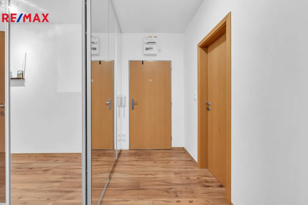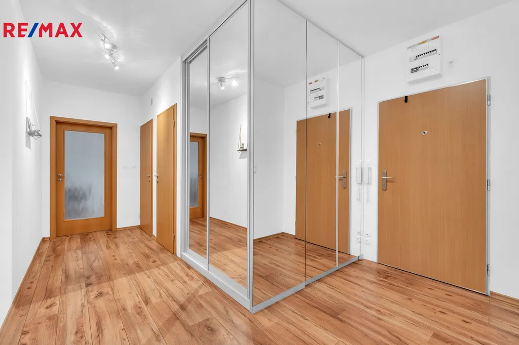 Bytová jednotka - dispozice: prostorná chodba s vestavěnými skříněmi na míru (botník a šatní), koupelna s vanou a podlahovým topením, ložnice se vstupem na terasu, dětský pokoj (lze využít i jako pracovnu), samostatná toaleta, kuchyňský kout s jídelním prostorem a obývacím pokojem se vstupem na terasu. Pokoje a terasa jsou orientovány na západ.
