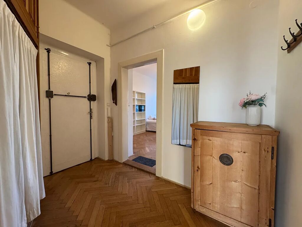 Byt je kompletně zařízený, jak si můžete prohlédnout na fotografiích. Obývací pokoj a kuchyň nabízí krásný výhled do parku. Vedle kuchyňské linky je dostatek místa na jídelní stůl. Obě ložnice jsou orientovány do klidného vnitrobloku. V koupelně s vanou a toaletou naleznete pračku. Vytápění a ohřev vody zajišťuje vlastní plynový kotel.