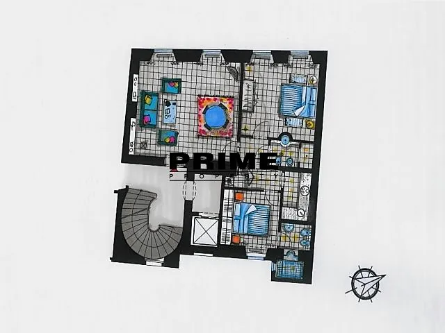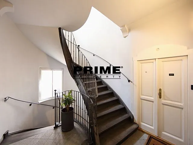 Z bytu je výhled na Pražský hrad a Čertovku. Dispozice bytu: obývací pokoj s krbem a barokním dřevěným malovaným stropem a s jídelní částí, samostatná, plně vybavená malá kuchyň se spotřebiči (sklokeramická varná deska, trouba, myčka, lednice a mrazák), ložnice s vlastní koupelnou (s hlubokou vanou/bazénkem, umyvadlem, toaletou a bidetem), druhá ložnice a druhá koupelna (se sprchovým koutem, umyvadlem, toaletou a bidetem).
