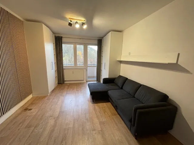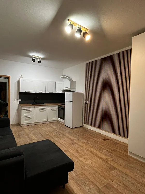 V bytě se nachází vstupní předsíň, koupelna s toaletou a obývací pokoj s kuchyní. V kuchyni je moderní kuchyňská linka s dotykovými kamny na vaření a pečící elektrickou troubou, digestoř, lednice. V obývací části se nachází moderní lamelový obklad na stěně naproti pohovce, který působí velmi vřelým a útulným dojmem. Na konci pokoje jsou dvě vestavěné, šatní a šuplíkové skříně. Ve zděné koupelně stojí automatická pračka, koupací vana, umyvadlo se zrcadlem, infrazářič. Naproti koupelně se nachází toaleta, ukládací skříňka a zrcadlo. Okna a lodžie jsou v plastu, opatřena zatemňovacími závěsy. Na podlahách je v předsíni a v koupelně dlažba, v obývací místnosti položen vinyl. K bytu náleží prostorná lodžie, která je situována na východní stranu domu.