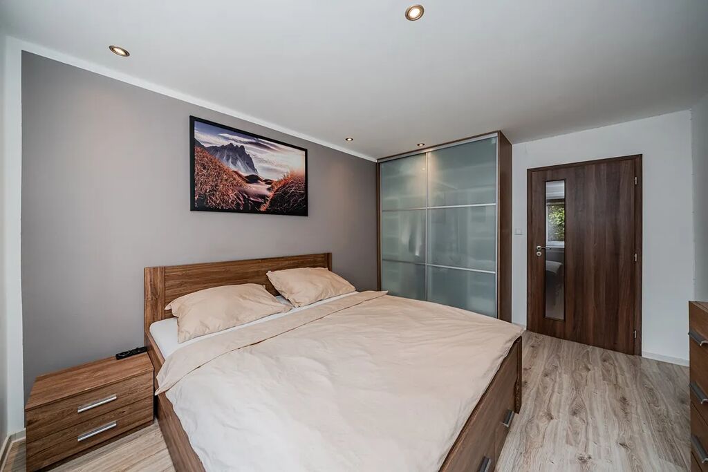 Obývací pokoj (14,3 m²) s francouzským oknem a balkónkem je vybaven pohodlnou sedačkou, konferenčním stolkem, obývací stěnou a plovoucí podlahou. V ložnici (13,3 m²) najdete manželskou postel, dvě šatní skříně a komodu.