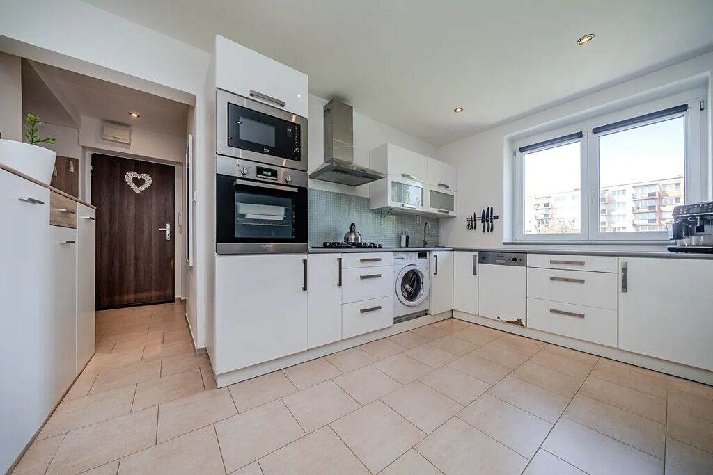 Byt je po celkové rekonstrukci (cca 10 let) a nabízí moderní a pohodlné bydlení. V kuchyni (14,3 m²) je dlažba s podlahovým vytápěním, rohová kuchyňská linka včetně spotřebičů – lednice s mrazákem, myčka, horkovzdušná trouba, mikrovlnná trouba, plynová varná deska, digestoř a pračka. K dispozici je také jídelní stůl a 4 židle.