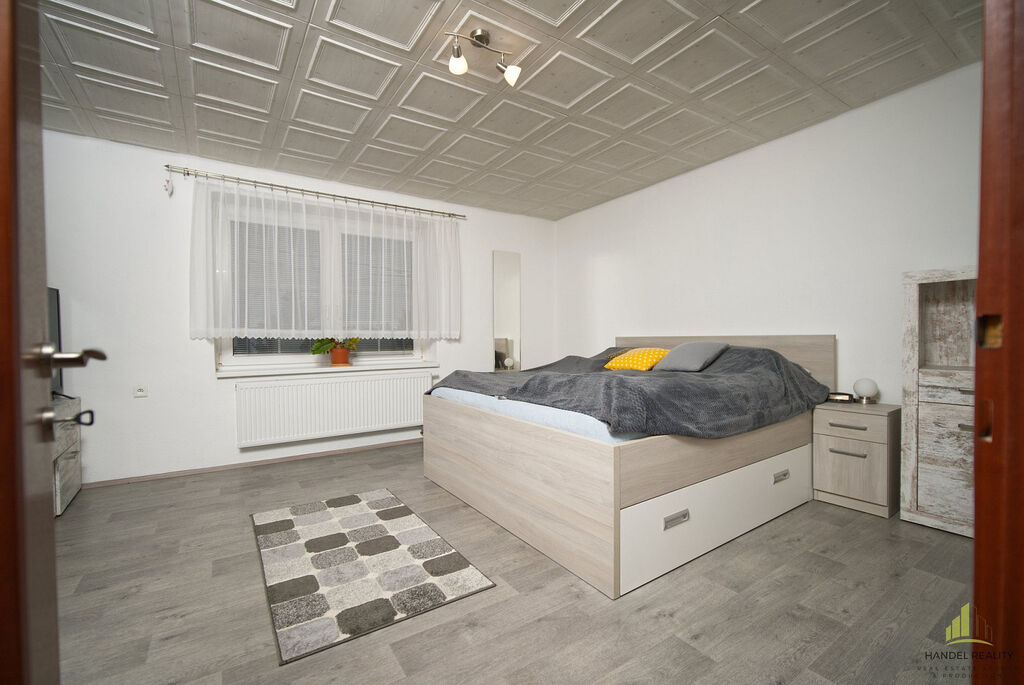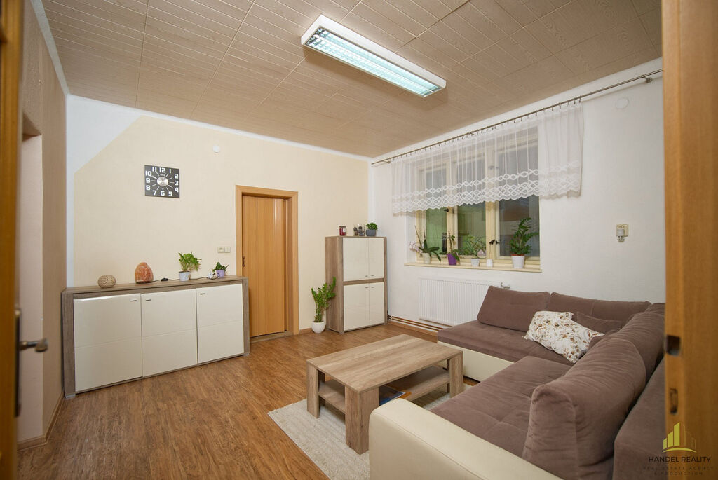 Součástí je přístavek se třemi místnostmi (12 m², 10 m² a 6 m²) + garáž, kůlna a sklep.
