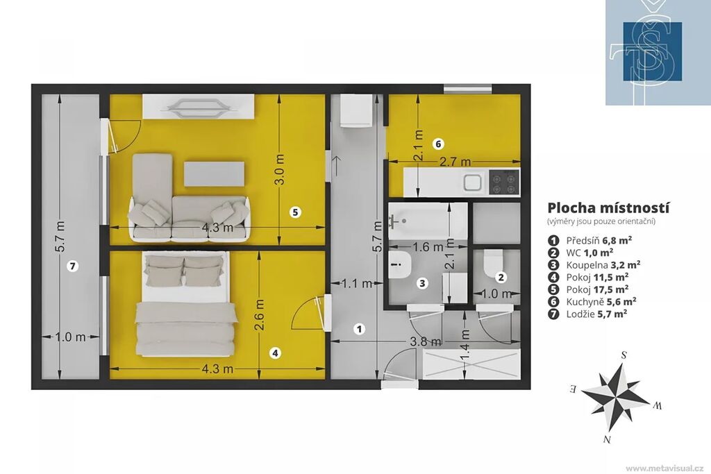 Dispozice bytu je praktická a vzdušná oba pokoje jsou samostatné, kuchyně s dostatkem prostoru a na chodbě najdete velkorysý úložný prostor. Obývací pokoj předěluje příčka (dosazena později), která jde odstranit a tím se místnost zvětší a vytvoří plynule navazující prostor na kuchyň, viz fotodokumenatce vizualizace či video možného řešení. V roce 2009 se v bytě rekonstruovalo bytové jádro.