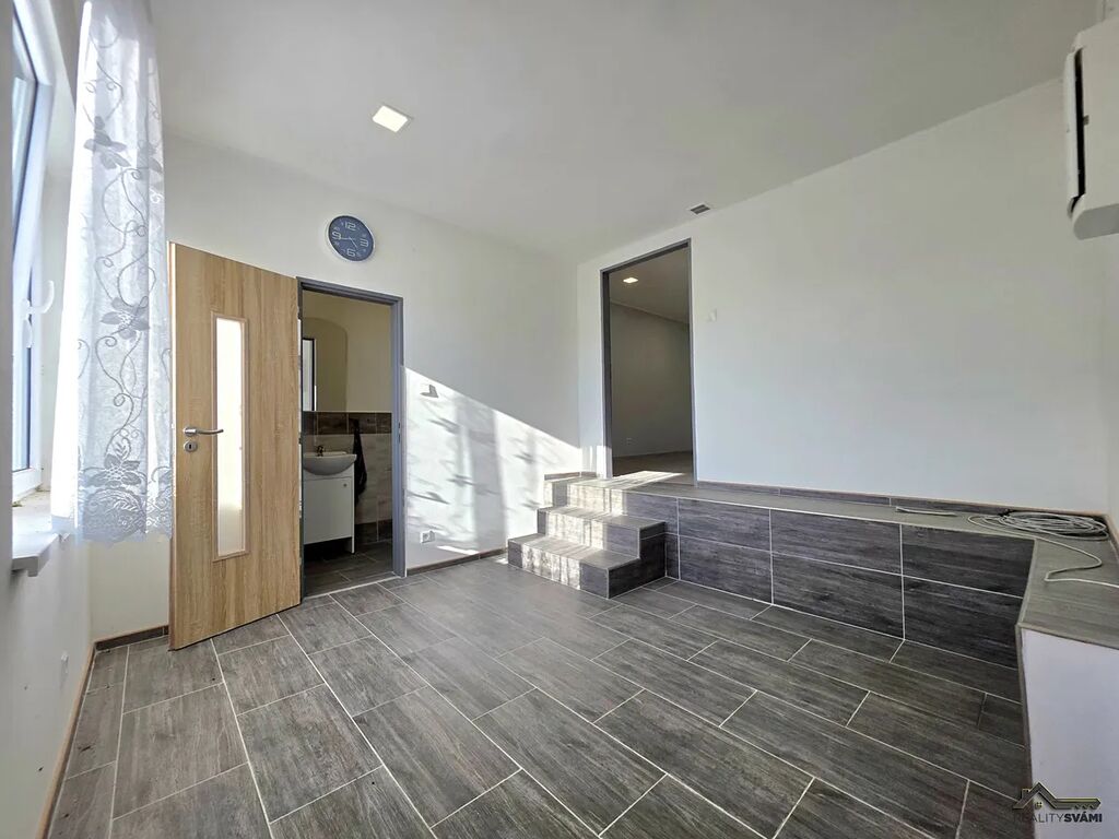 Navazující část: bar, krbová kamna, posezení, 2x WC – vhodné pro kavárnu, vinárnu, kadeřnictví, masáže, wellness, jednací místnost apod.