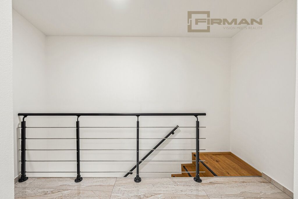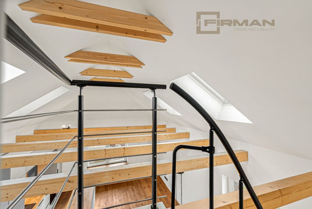 Horní byt s dispozicí 3kk s balkonem a podkrovní místností 27 m², kde je snížená výška stropu, proto ji neuvádím jako samostatný pokoj, vás okouzlí velkorysým obývacím prostorem s novou kuchyní, vybavenou moderními spotřebiči, přiznanými dřevěnými trámy a vysokými stropy, které mu dodávají jedinečný charakter. O přítmí během slunečních dnů se postarají dálkově ovládané střešní žaluzie a z oken můžete vnímat energii největšího známého keltského oppidia v Čechách i ve Střední Evropě – Závist, které se rozprostírá na protilehlém břehu Vltavy.