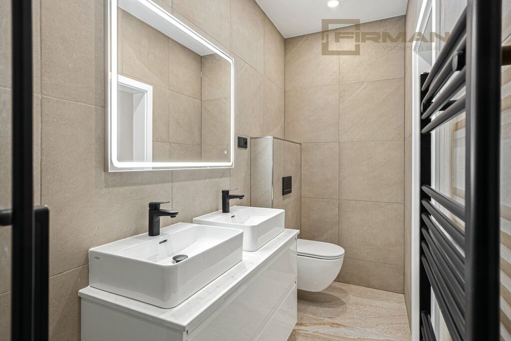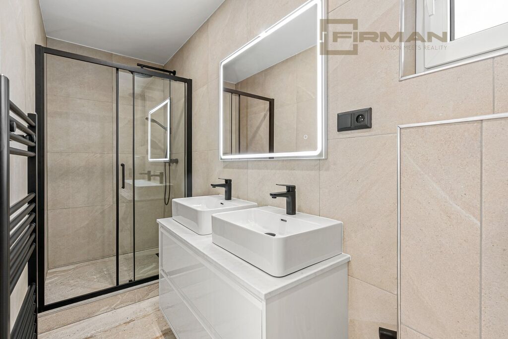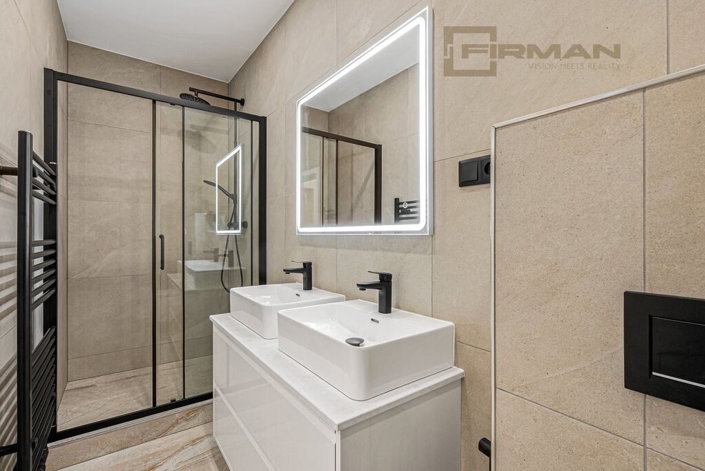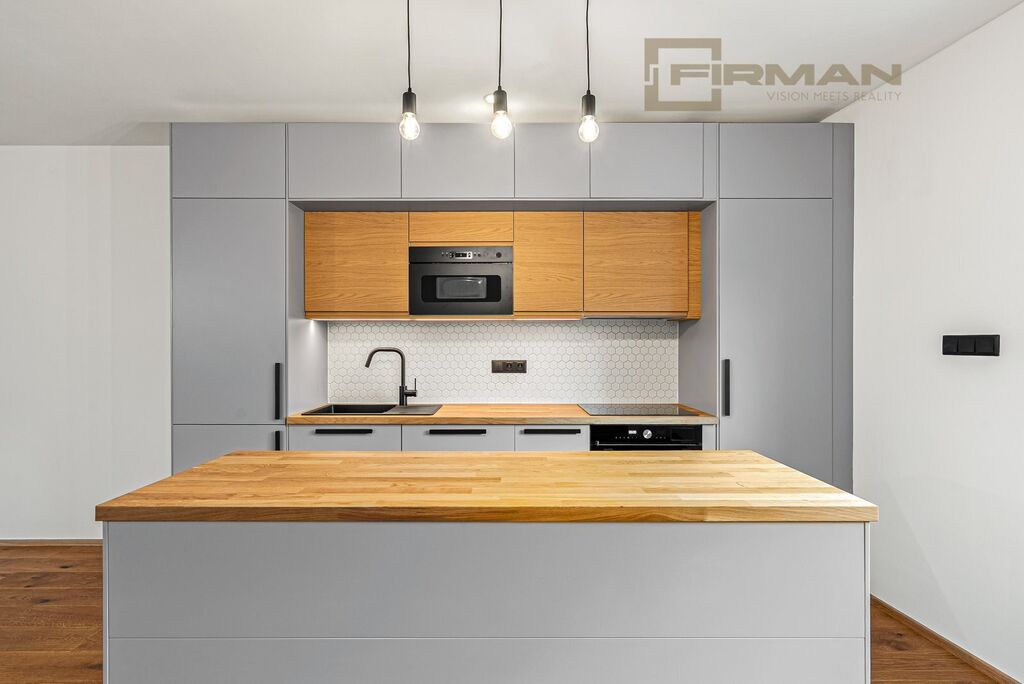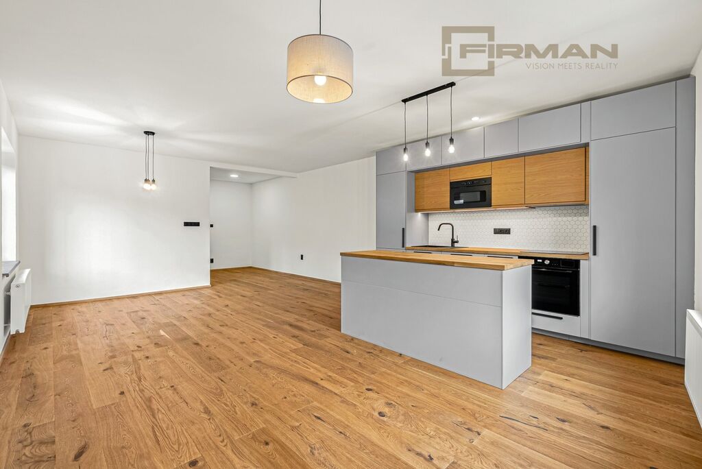Spodní byt o dispozici 2kk + pracovna je proveden s použitím stejných materiálů, je zde také nová, moderní kuchyně a stejně jako u horního bytu byl i zde kladen důraz na kvalitní zpracování a především na vytvoření příjemné atmosféry, abyste se zde od prvního okamžiku cítili doma.
