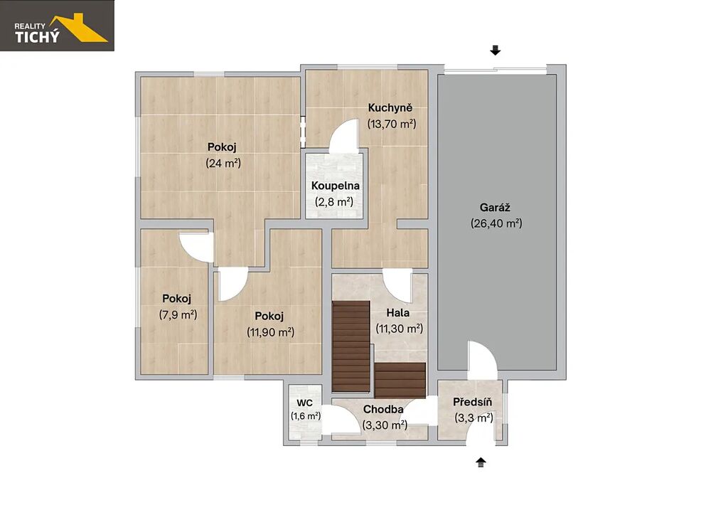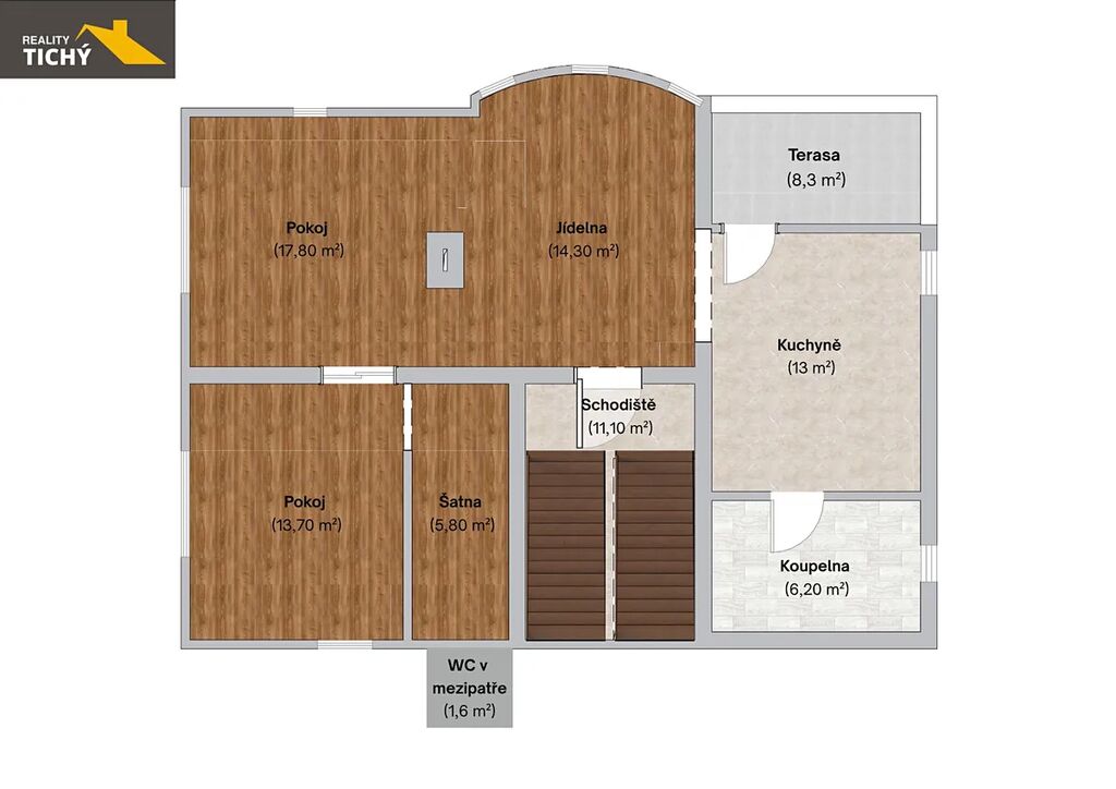 2. patro dřevěné + dlažba (podlahové topení v kuchyni a koupelně)