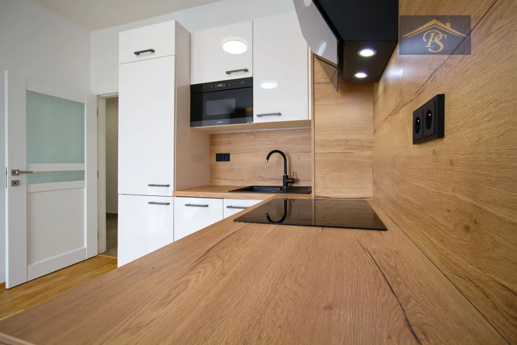Kuchyňský kout: nadčasová kuchyňská linka na míru v elegantním designu s dostatkem úložného prostoru a kvalitním kováním. Součástí jsou vestavné spotřebiče – lednice s mrazákem, myčka, mikrovlnná trouba, indukční varná deska a tichá digestoř. Pracovní deska i obklady jsou v moderním, snadno udržovatelném provedení. Celý prostor působí velmi čistě a harmonicky, s důrazem na detail a funkčnost. Podlaha je plovoucí, samozřejmostí jsou zásuvky pro TV a internet.
