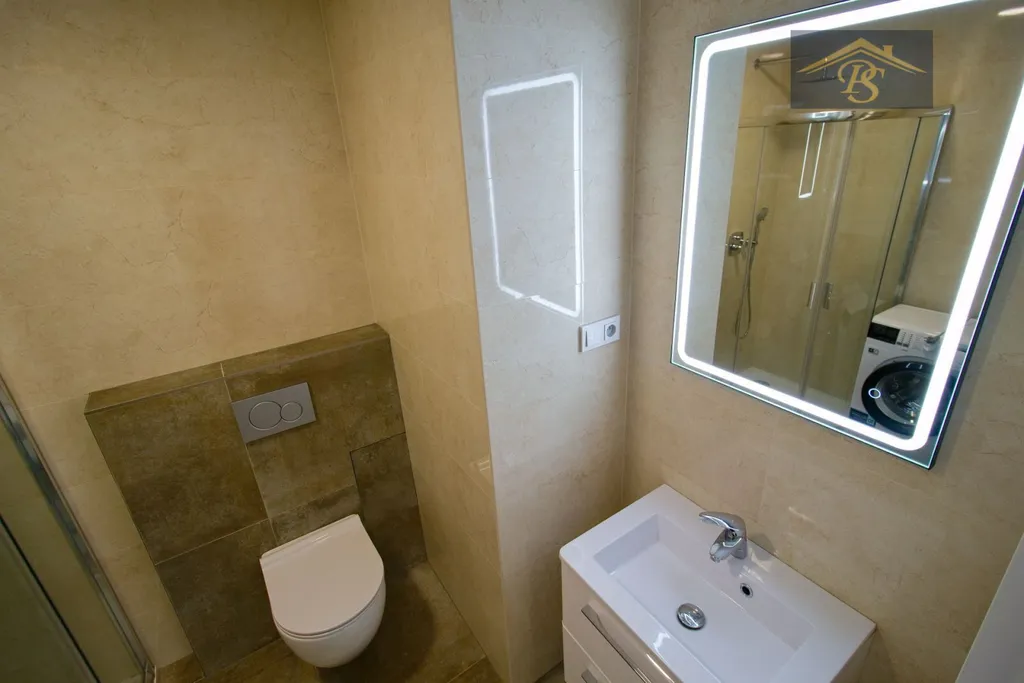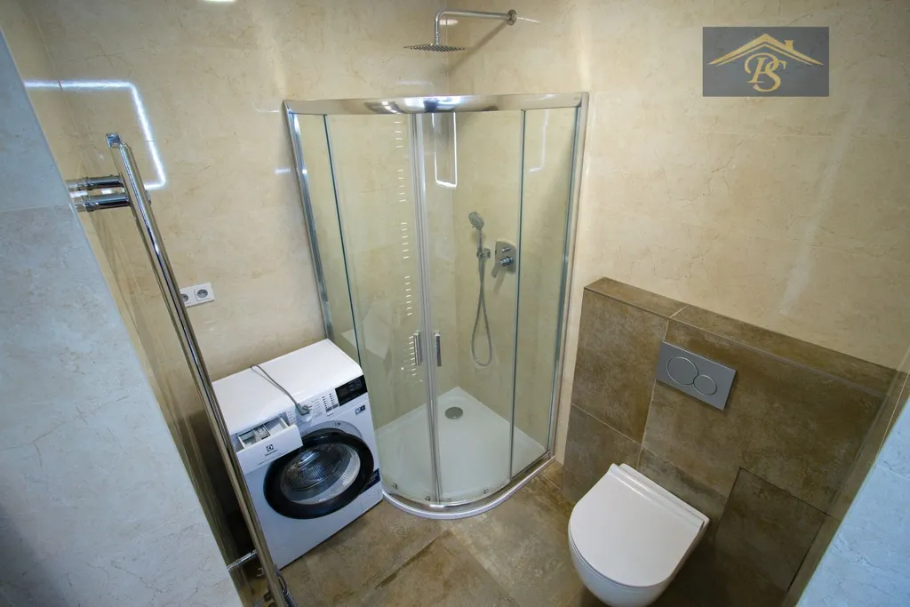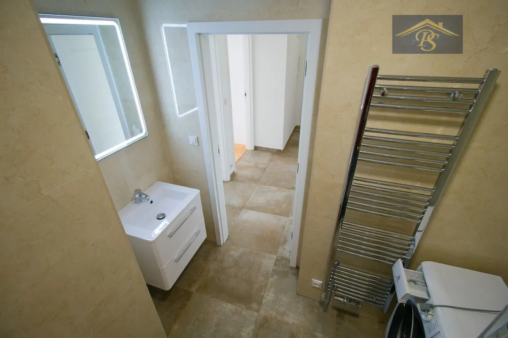 Koupelna: elegantní a moderní prostor s kvalitními materiály a promyšleným designem, který harmonicky navazuje na kuchyňský kout. Součástí je prostorný sprchový kout se skleněnou zástěnou, závěsné WC Geberit, umyvadlo se skříňkou s úložným prostorem, dotykové zrcadlo s podsvícením, pračka a topný žebřík. Keramická dlažba a obklady v neutrálních tónech podtrhují čistý a stylový vzhled celé koupelny, která působí svěže a komfortně.
