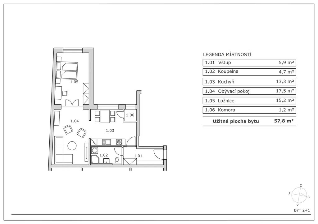 Dispozice nabízí prostornou vstupní chodbu s možností umístit zde šatní skříně. Z chodby se vchází do koupelny, součástí které je sprchový kout, umyvadlo a toaleta. Vedle sprchového koutu je prostor na pračku a sušičku šířky 60cm. Z chodby je dále vstup do kuchyně, která je průchozí do obývacího pokoje a dále pak do ložnice. V kuchyni je i praktická komora/spíž, která je větraná oknem. Kuchyňská linka obsahuje indukční varnou desku, elektrickou troubu, myčku, cirkulační digestoř a lednici. Obývací pokoj nemá okno, ale je prosvětlen otevřeným otvorem přes kuchyň a prosklenou stěnou přes ložnici.