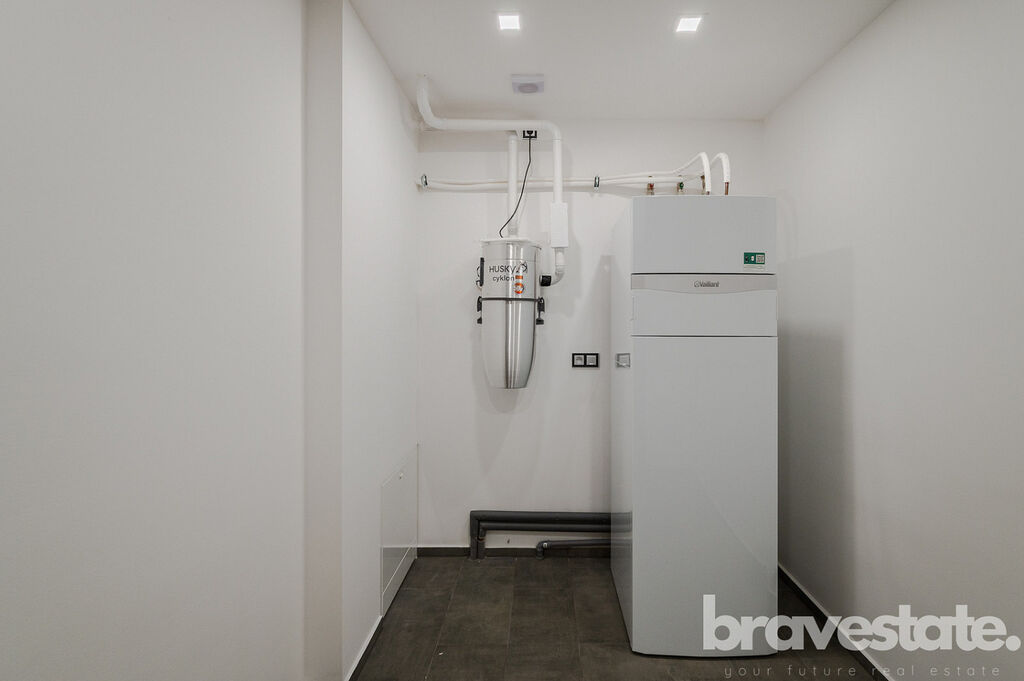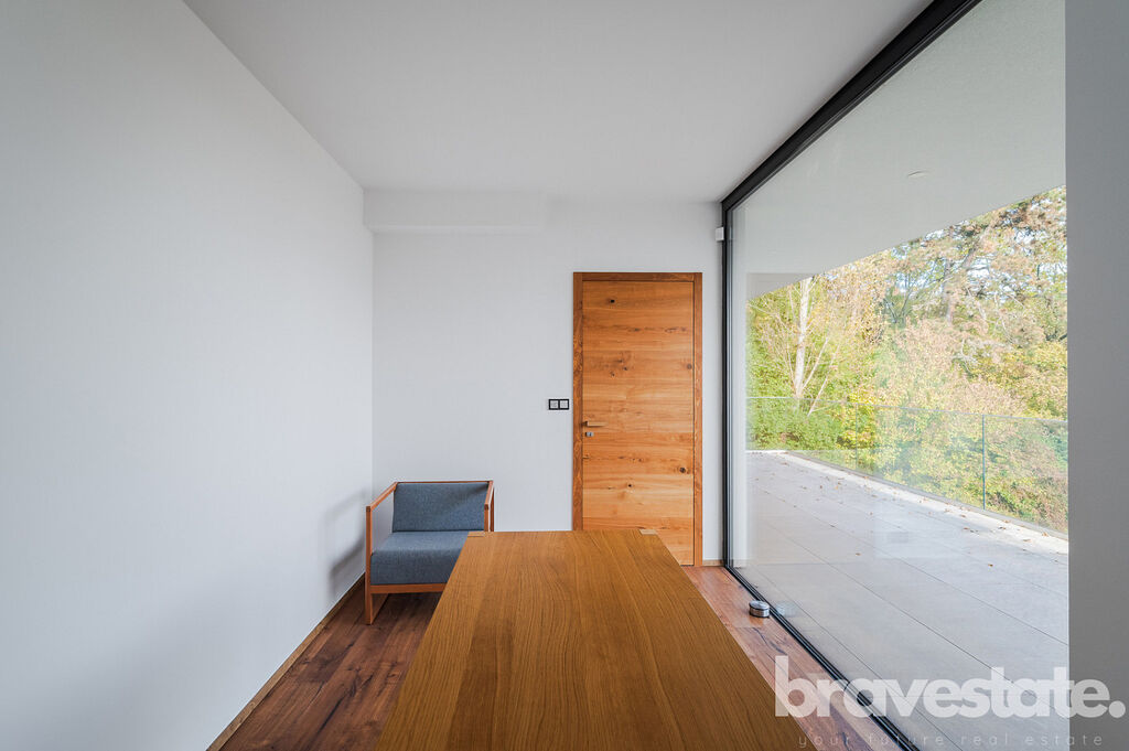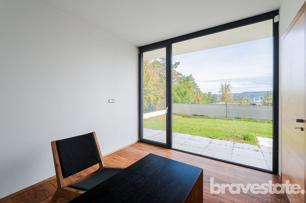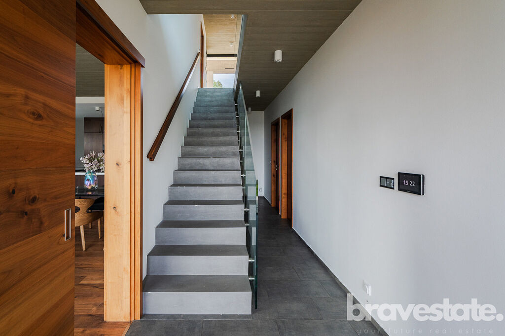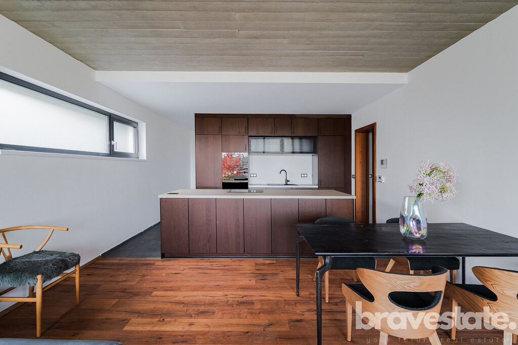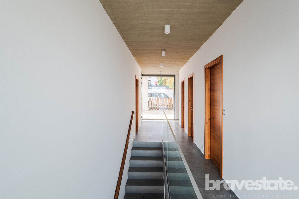 Nabízím k prodeji dvoupodlažní moderní vilu o dispozici 5+kk, s plochou střechou, částečně zapuštěnou do svahu v úrovni 1. NP. Dům je zděný, zateplený s vnitřními příčkami z Ytongu. Zastřešení domu je tvořeno plochými střechami a terasou. Okna hliníková s izolačním trojsklem. Teplovodní podlahové vytápění. V místnostech podlahy plovoucí, koupelny, WC keramická dlažba. Vnitřní dveře bezfalcové, lakované, hladké, plné. Vstupní dveře jsou bezpečnostní. Posuvná vjezdová brána z pozinkované oceli. Stěny interiéru jsou omítnuty štukovou omítkou, v exteriéru je použita probarvená silikátová omítka. Příjezdová zpevněná plocha je řešena z betonové skládané dlažby, na terasách je lepená keramická dlažba. Zdrojem tepla je tepelné čerpadlo.
