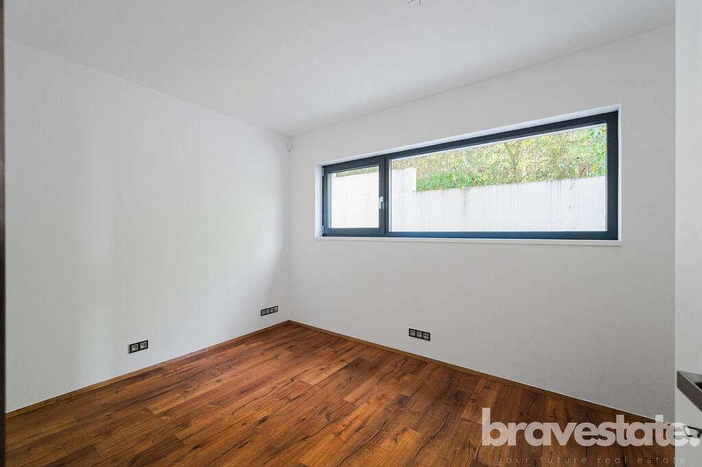 V 1. NP se nachází hlavní obytný prostor s kuchyní a spíží, dětský pokoj/ložnice - obojí se vstupem na zahradu. Další pokoj/ložnice. Koupelna se saunou, technická místnost a separátní toaleta.