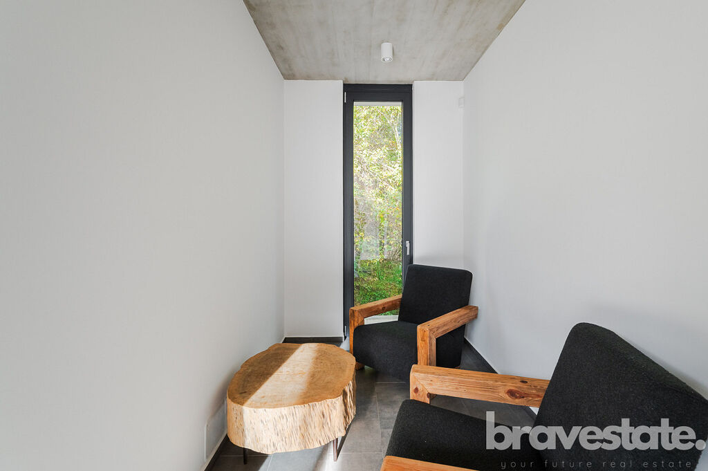 Ve 2. NP se nachází hlavní vstup s předsíní, pokoj pro hosty/pracovna a druhý pokoj/ložnice se vstupem na terasu. Koupelna se sprchovým koutem, umyvadlem s výhledem do lesa. A separátní toaleta.