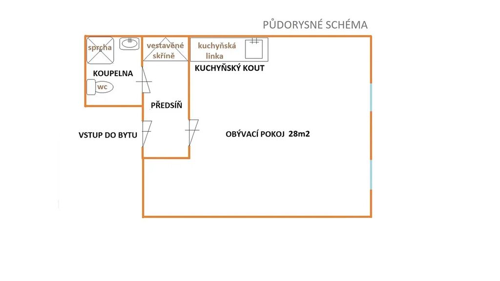 Dispozice bytu: z předsíně se vstupuje do velké obytné místnosti cca 28m2 a do koupelny s WC.