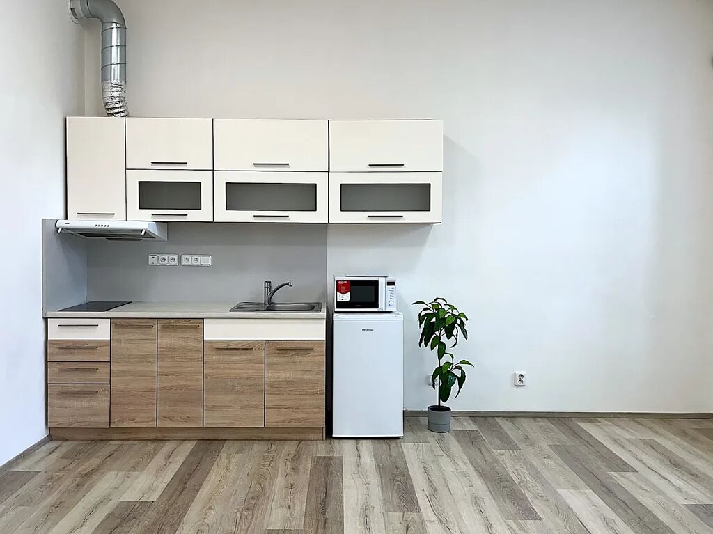 V obývacím pokoji je kuchyňský kout, vybavený kuchyňskou linkou včetně varné desky, digestoře a mikrovlnky a ledničky. Připojení na pračku je vedle lednice.