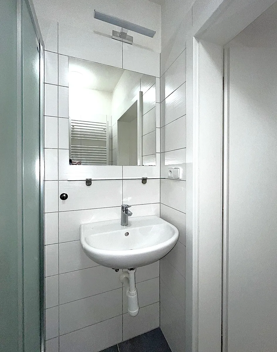 V předsíni jsou nové vestavěné skříně. Koupelna a WC jsou vybavené sprchovým koutem a umyvadlem se zrcadlem. Celý byt je v bílé barvě s béžovou vinylovou podlahou.
