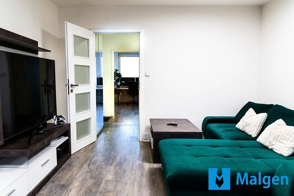 Dispozice bytu zahrnuje prostorný obývací pokoj propojený s moderním kuchyňským koutem včetně spotřebičů, ložnici, další pokoj (aktuálně využívaný jako pracovna), koupelnu s vanou a samostatnou toaletu. Součástí je také zasklená lodžie (7 m²) s klidným výhledem do vnitrobloku se zelení a dětským hřištěm. V bytě je dostatek úložných prostor, včetně vestavěných skříní, a komfort zvyšuje i elektrické podlahové vytápění v koupelně a na toaletě. Dle dohody je možné ponechat i zánovní vybavení a nábytek.