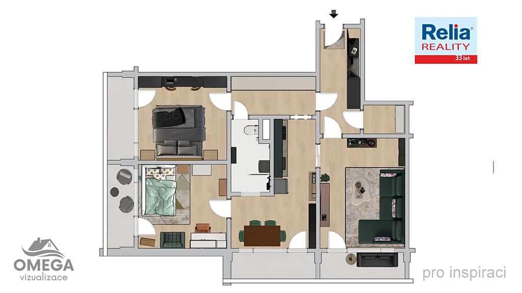 Parametry a dispozice bytu: Celková plocha bytu činí téměř 90 m², což zahrnuje bytovou plochu 73 m², čtyři lodžie o celkové výměře 15 m² a sklepní kóji. Výhodou je, že kromě lodžie přístupné z prostorné kuchyně ve tvaru L (která je dostatečně velká i pro jídelnu), má i každý ze tří samostatných pokojů svou vlastní lodžii. Dispozice zajišťuje dostatek soukromí pro všechny členy domácnosti. V bytě je navíc samostatná komora a v suterénu sklepní kóje.
