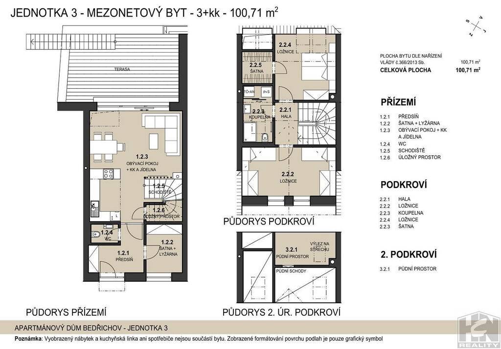 V tomto apartmánovém domě nabízíme mezonetovou jednotku k prodeji v dispozici 3+kk s celkovou plochou 133,42m² z toho plocha bytu 100,71 m² (plocha bytu dle nařízení vlády č.366/2013 Sb. ) s terasou (25,9 m²) a s obytným půdním prostorem. Všechny apartmány obsahují v ceně jedno parkovací stání. Každý apartmán má úložný prostor pro kola nebo lyže.