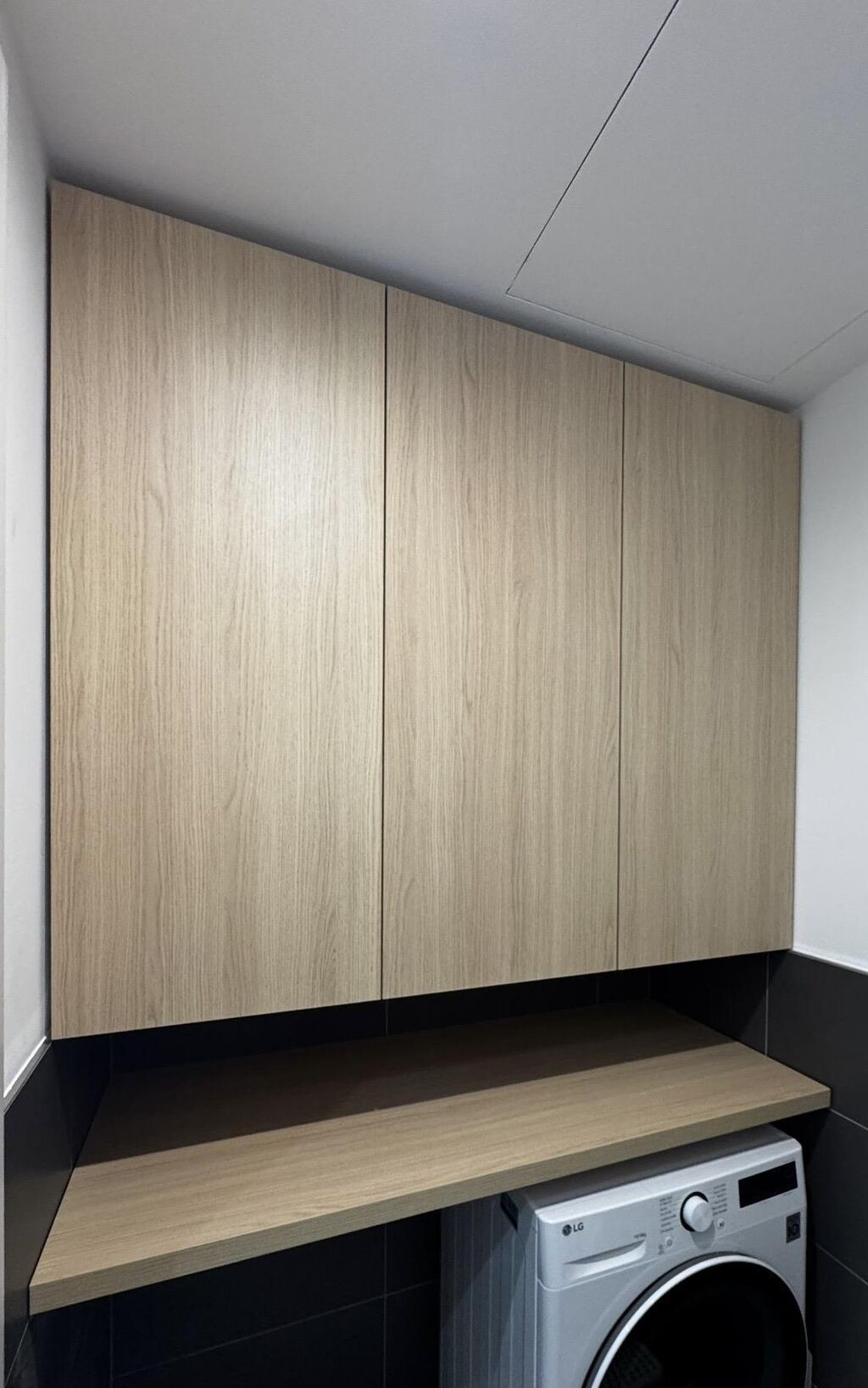koupelna s vanou, umývadlem se zavšenýmel. sušákem, úložnými skříňkami a policemi