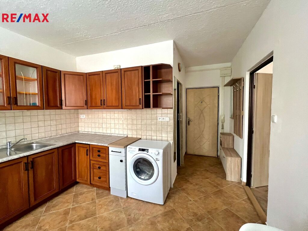 Dispozice bytu je praktická: malá předsíň, samostatný pokoj s šatní skříní, kuchyňská část s linkou, plynovým sporákem, jídelním stolem, lednicí a pračkou. Koupelna se sprchovým koutem, WC a koupelnovou skříňkou. Topení i ohřev vody jsou řešeny dálkové.