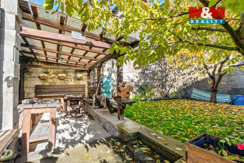 Na zahradě najdeme prolézačky pro děti a krásnou pergolu s grilem. Ale nebojte, místo na bazén se také najde.