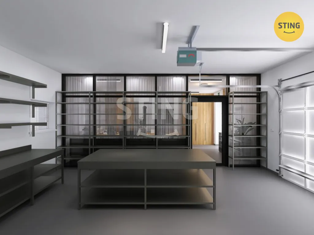 Dispozice zahrnuje prostorný skladovací prostor s novými garážovými vraty vhodnými pro pohodlnou manipulaci a logistiku, dále kancelář, kuchyni s novou kuchyňskou linkou a samostatné WC. K dispozici jsou také čtyři vyhrazená parkovací místa před objektem.