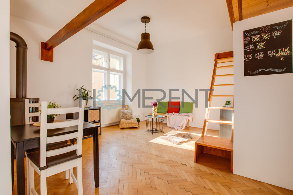 Interiér doplňují krásné dřevěné podlahy a kamna, která spolu s radiátorem zajišťují příjemnou atmosféru a pohodlí během celého roku. Z obývací části je přístup na malý balkónek orientovaný do vnitrobloku, což poskytuje klid a dostatek přirozeného světla.