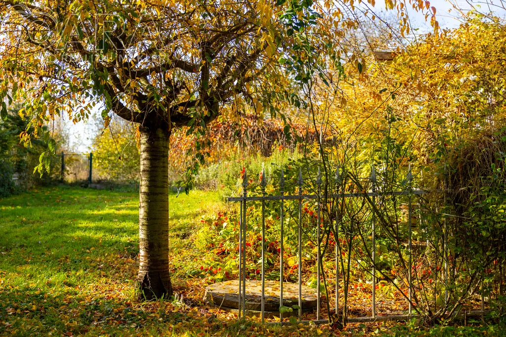 Zahrada je ze tří stran obklopena pouze zelení ze sousedních pozemků, poskytuje tudíž naprostý klid. Zahrada byla citlivě a vkusně dlouhodobě budována a nachází se na ní celá řada jehličnatých vzrostlých stromů, ale také magnolie, fík, kdoule a různé okrasné keře.