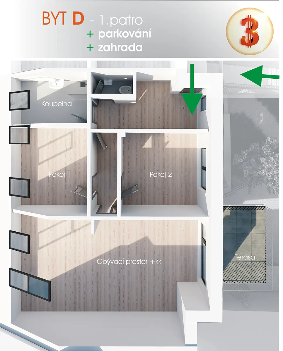S velkorysou užitnou plochou celých 94 m² doplněnou velkým terasovým balkónem o ploše dalších 14m2, s výhledem do celého unikátního dvora a jeho přiléhajících zahrad a dokonce i s vlastní plnohodnotnou zahradou ihned za tímto dvorem či parkováním v tomto bezpečně uzavřeném dvoře, poskytuje tento byt více jak dostatek celkového prostoru a zázemí pro naprosto komfortní životní styl. K bytu pak náleží samozřejmě také ještě další doplňující úložný prostor. Je zkrátka navržen tak, aby splňoval všechny současné standardy, a to nejen moderního ale také opravdu spokojeného bydlení.
