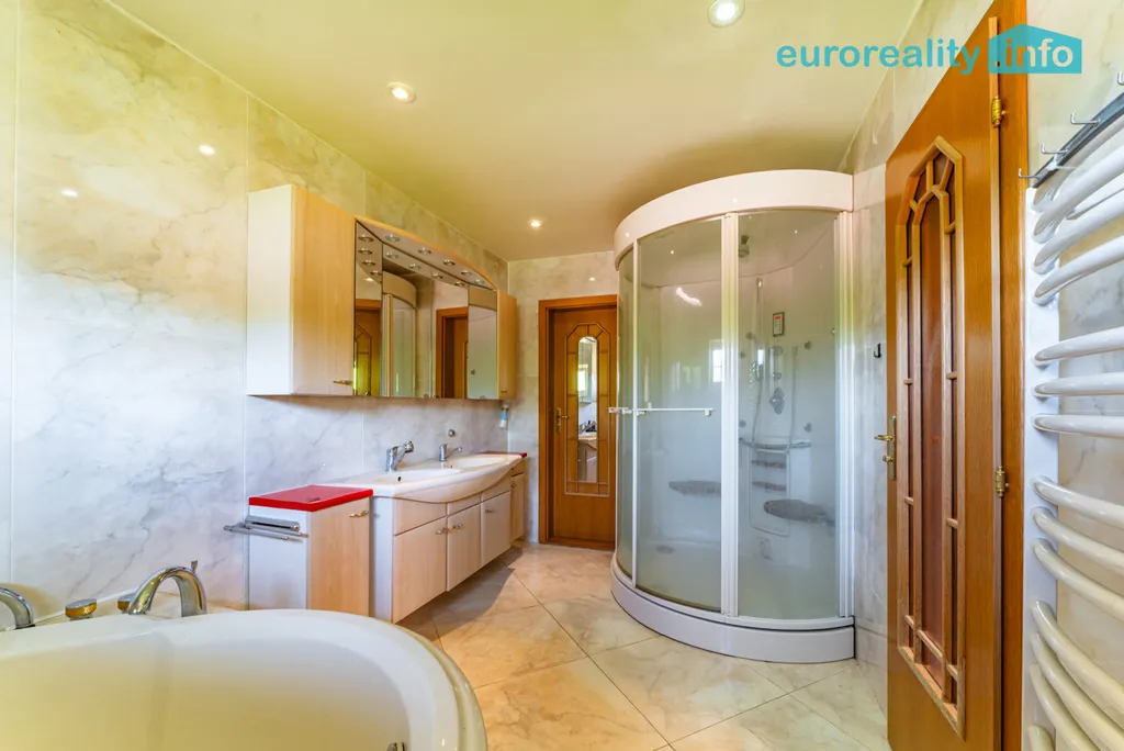 Součástí nemovitosti jsou dvě zachovalé kuchyně s vestavěnými spotřebiči a dvě koupelny vybavené hydromasážní vanou. V přízemí se nachází prostorná společenská místnost s barem, zázemím a krbem, který podtrhuje jedinečnou atmosféru domu.