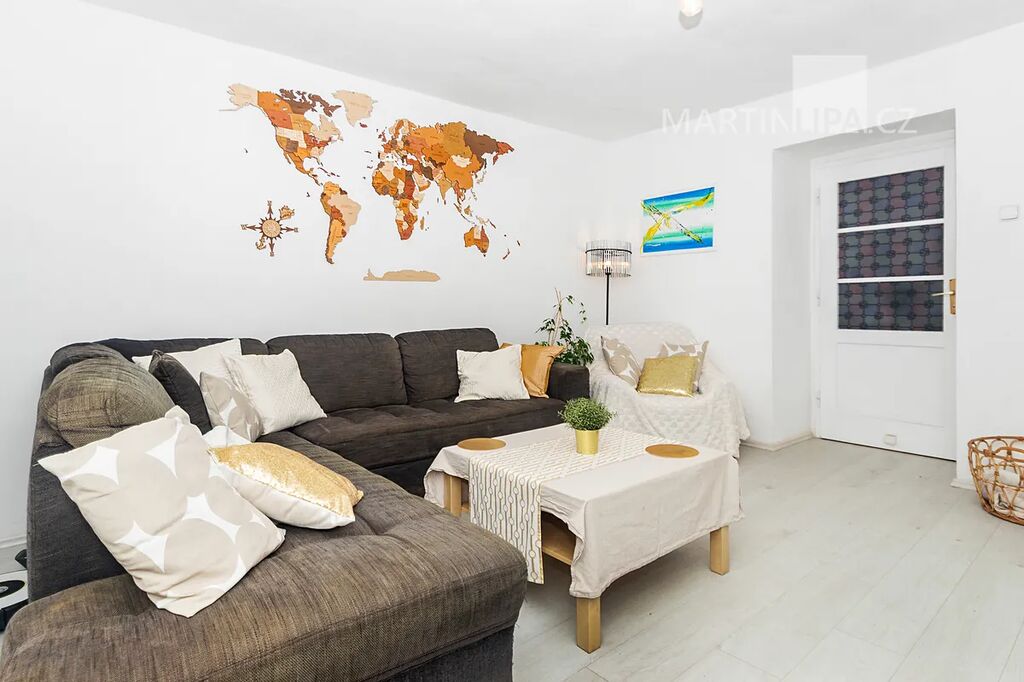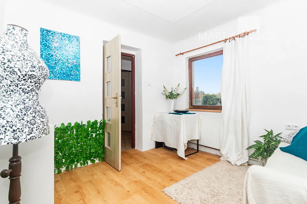 Kuchyň je tak akorát velká, aby se do ní vešel i jídelní stůl, na ni přirozeně navazuje menší pokojík s širokými zašupovacími dveřmi, takže pokud v této místnosti uvidíte spíše potenciál rozšířené obývací zóny, bez úprav toho docílíte. Případně úplně příčku zrušte a máte obývací pokoj s kuchyní dohromady.