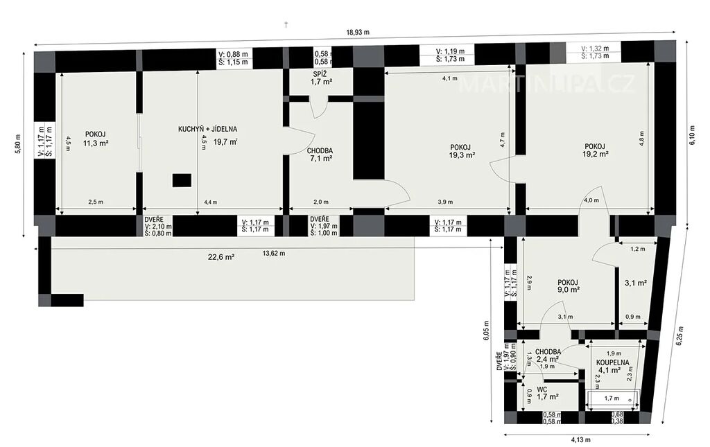 Podlahová plocha bez půdy činí 98m2, půda k tomu přidává dalších 80m2.