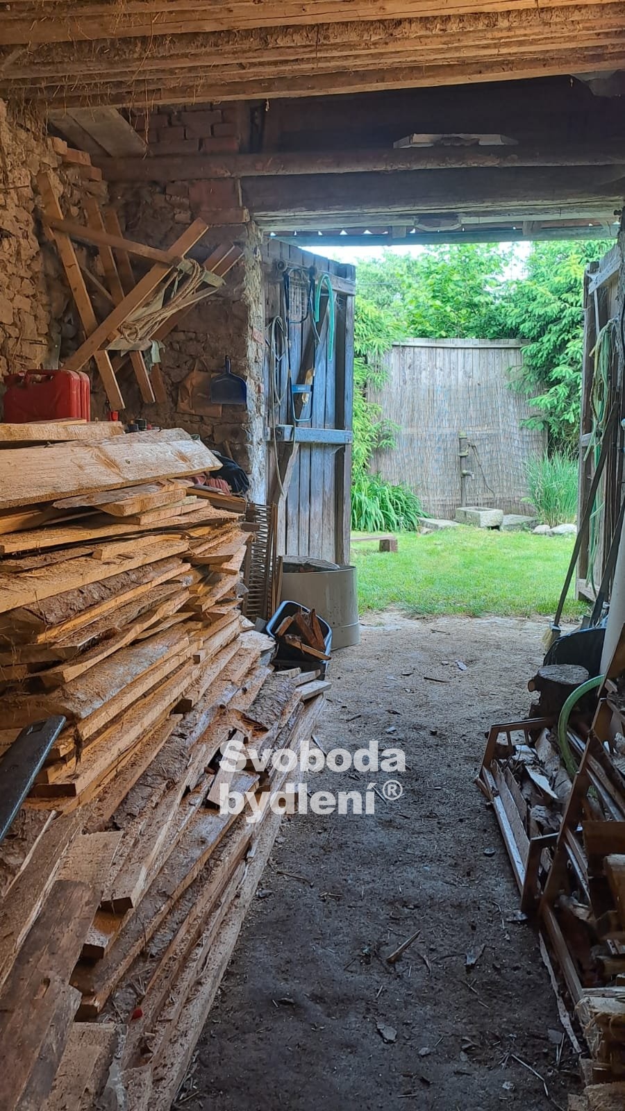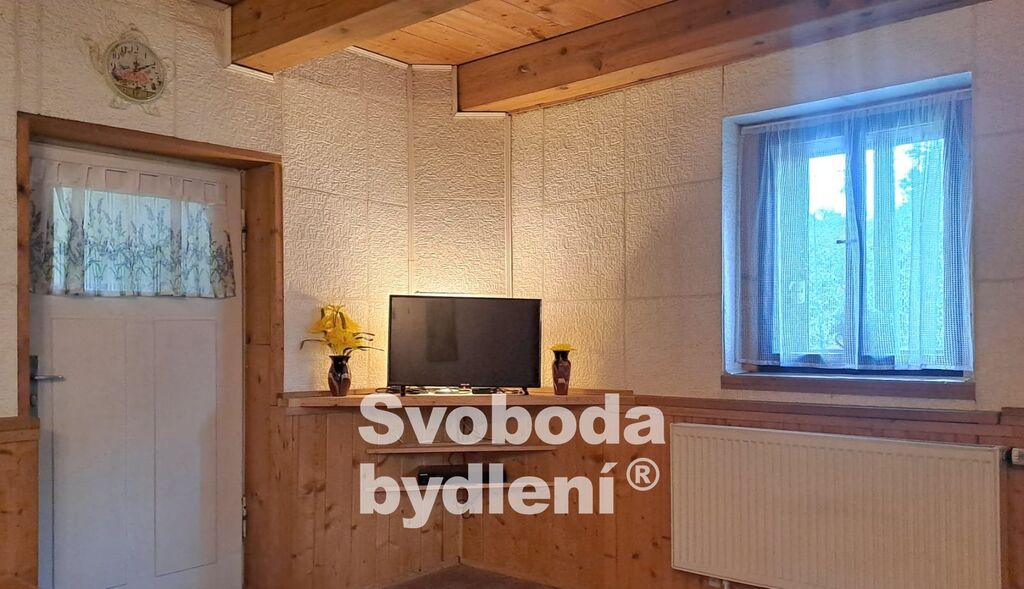 Uvnitř vás přivítá chodba s původní dlažbou, ze které vstoupíte do koupelny s vanou a WC. Hlavní obytný prostor (cca 29 m²) je ideálním místem pro pohodové večery – díky krbovým kamnům Hass a Sohn a trojici oken je světlý a útulný. V podkroví najdete prostornou ložnici (cca 25 m²) s dřevěným střešním oknem Vekra.