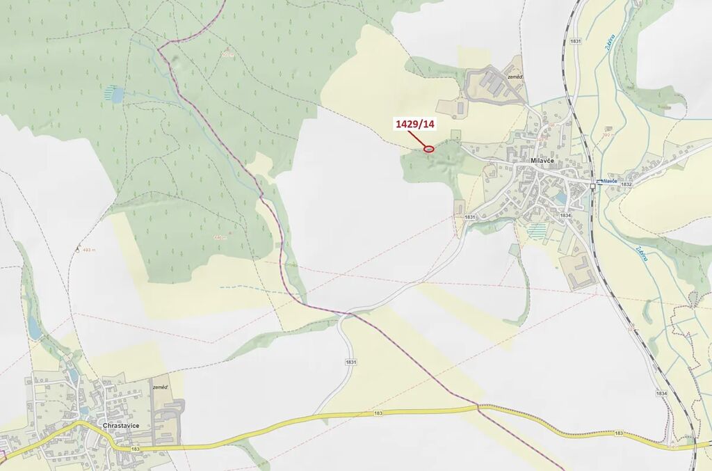 Ostatní plocha o výměře 80 m2, parcelní číslo 1429/14, podíl 1/1, katastrální území Milavče, obec Milavče, obec s rozšířenou působností Domažlice, okres Domažlice, Plzeňský kraj.