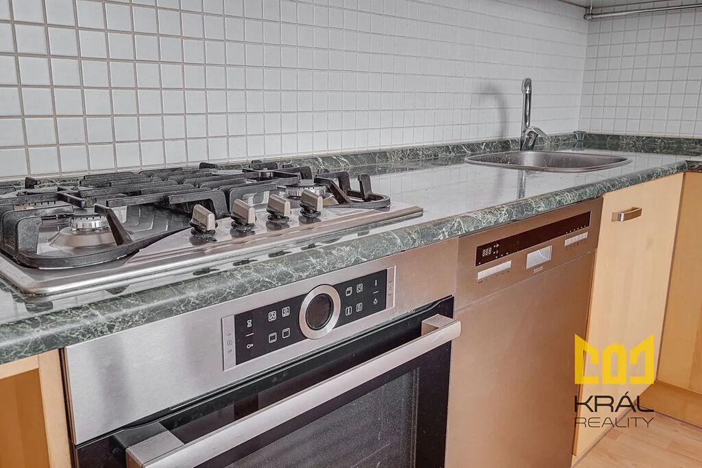 Kuchyně: Samostatná kuchyň s dostatkem úložných prostor, vybavena horkovzdušnou troubou, myčkou, plynovým sporákem, lednicí a jídelním stolem s dalšími úložnými prostory.
