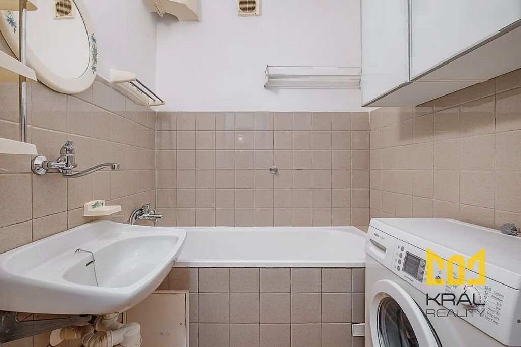 Koupelna: Vybavena vanou, umyvadlem a pračkou, laděna v jednoduché barevné kombinaci.