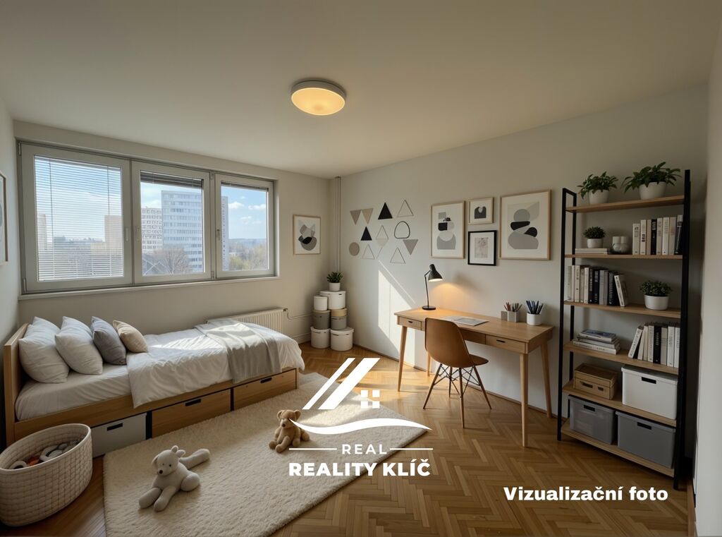 Z obývacího pokoje je vstup na zasklený balkón s příjemným výhledem. Dva další pokoje lze využít jako ložnici a dětský pokoj nebo pracovnu.