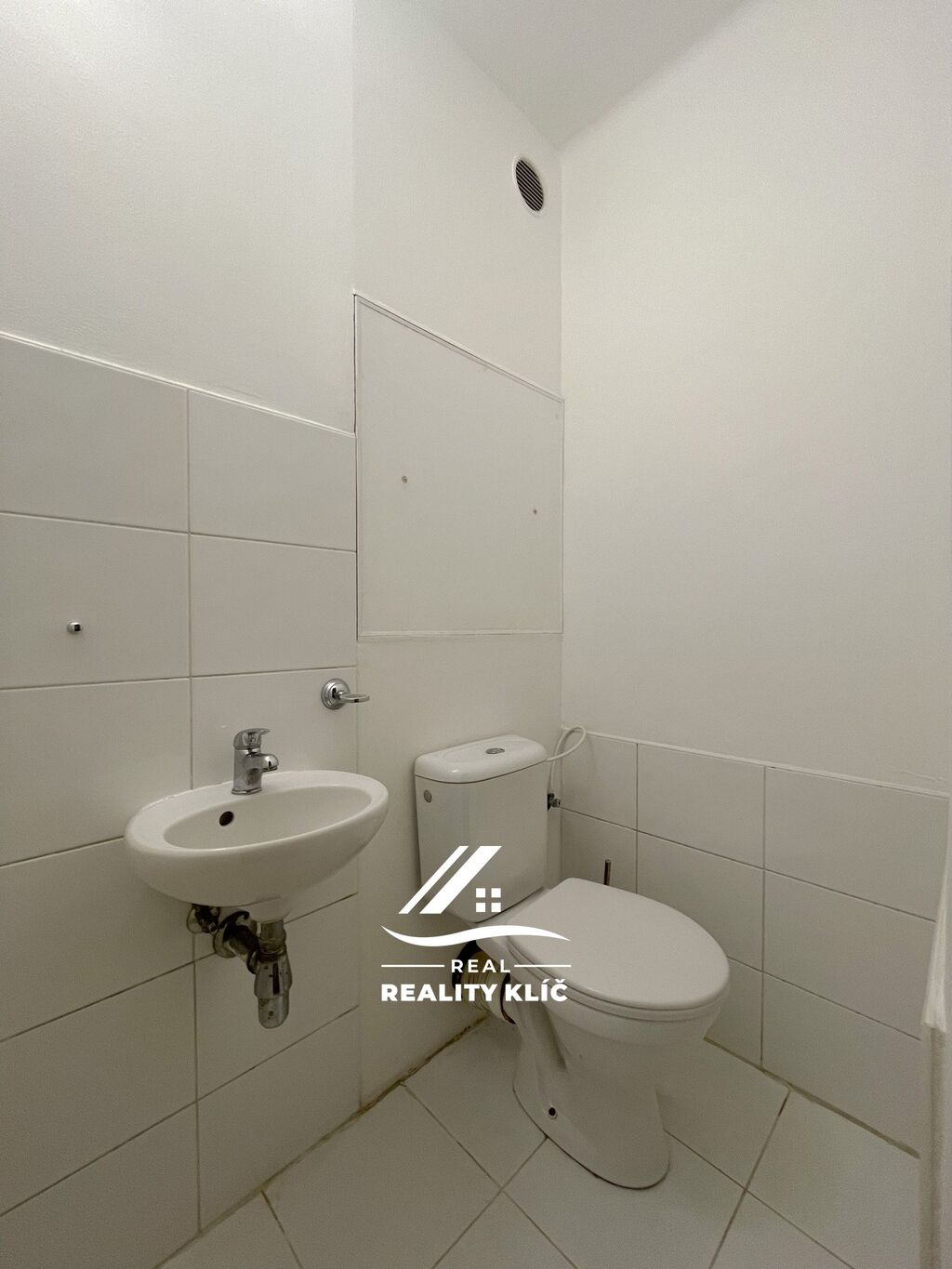 Koupelna je samostatná, s vanou, umyvadlem a úložnými skříňkami. Toaleta je rovněž samostatná a doplněná malým umyvadlem.