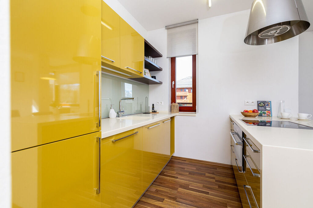 Hned při vstupu do bytu se nachází chodba s vestavěnou skříní, která nabízí dostatek úložného prostoru. Koupelna je vybavená sprchovým koutem, toaletou, umyvadlem s uloženým prostorem a pračkou. Ložnice je disponuje manželskou postelí, komodou, nočními stolky a má přímý vstup na terasu. Hlavní obytný prostor je otevřený a propojuje kuchyňský kout, jídelnu a obývací pokoj. Kuchyňská linka je moderně vybavena troubou, indukční varnou deskou, designovou digestoří, mikrovlnnou troubou a myčkou. V obývací části najdete pohodlnou sedací soupravu, TV stolek, konferenční stolek, komody a jídelní stůl se židlemi. Z této místnosti je rovněž přístup na prostornou terasu s venkovním posezením, která je průchozí i do ložnice.